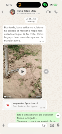 Moses versicherte, dass die Quelle in der kommenden Woche wieder funktionsfĂ€hig sein werde. Dass die Quelle grundsĂ€tzlich genutzt wird, bestĂ€tigte heute auch Ernesto, der Bodenleger. Er erkundigte sich nach dem Zustand der Quelle beziehungsweise informierte darĂŒber, dass sie derzeit defekt sei.